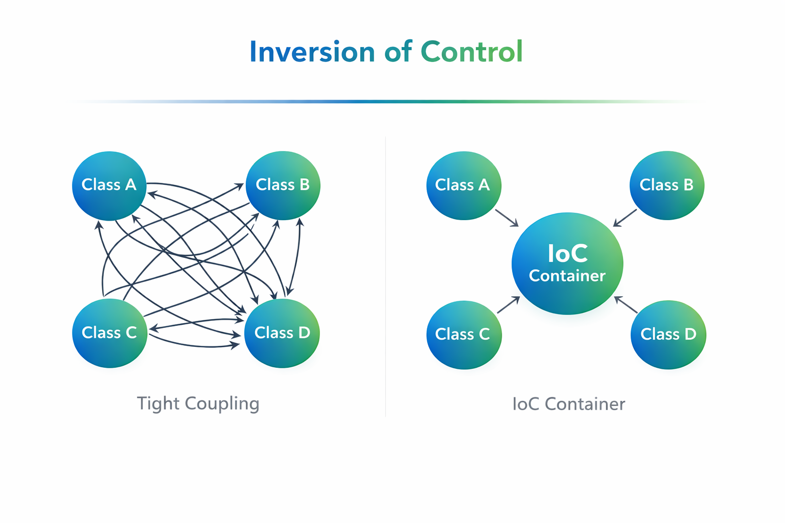 Инверсия управления (IoC) означает, что эти обязанности передаются внешнему компоненту — контейнеру.