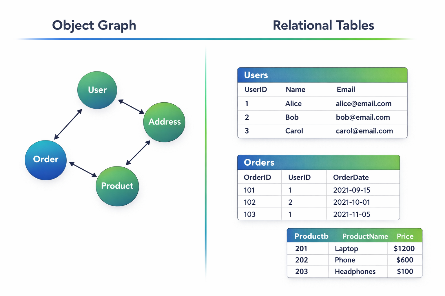 В коде мы работаем с объектами и ссылками между ними, а в базе данных — с таблицами, строками и внешними ключами. Эти модели не совпадают напрямую. Этот разрыв между объектной и реляционной моделью называется object-relational impedance mismatch.